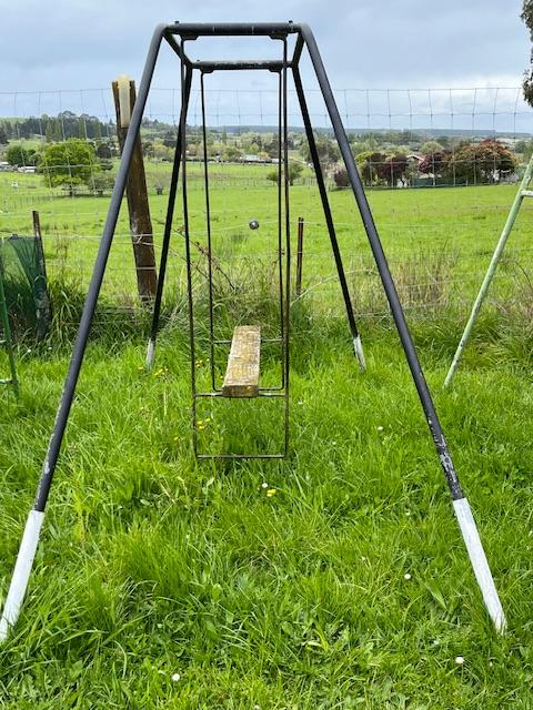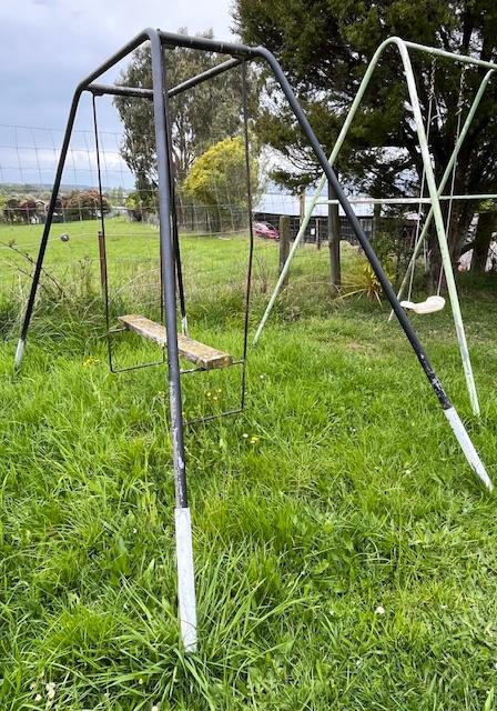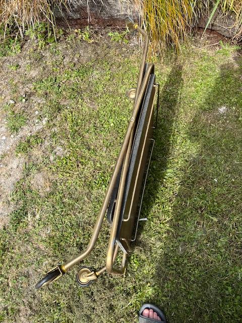 Solid steel frame, wooden seat; has leg extensions bolted on for added ground clearance.