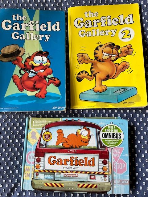 Garfield comic strip books circa 1980’s. 2 x soft cover (colour print), 1 x hardcover omnibus black & white.