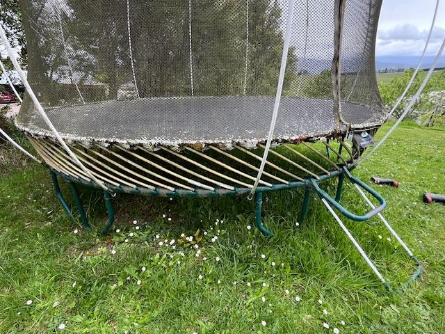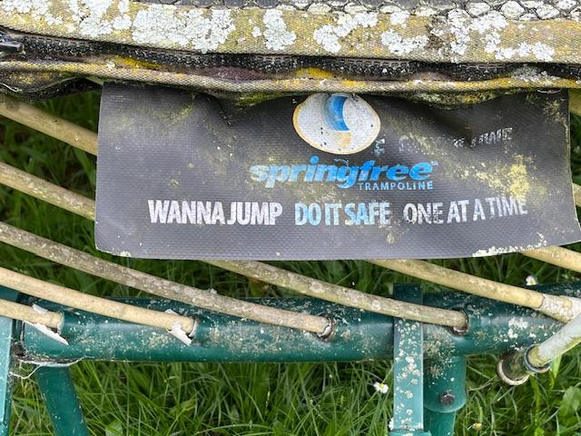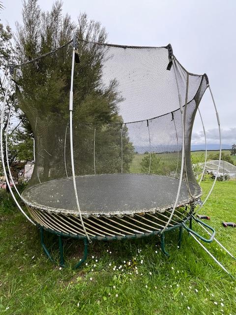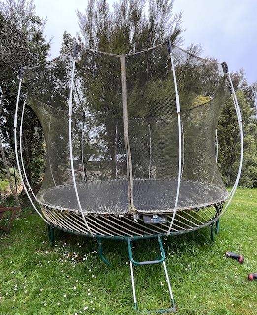 3m medium round Springfree trampoline. Well loved, has some cosmetic drawbacks (lichen on net & some of the plastic casings that cover the fibreglass rods have deteriorated but have brand new replacements for these) - still fully functional. Additional stepladder and wheels to move trampoline for mowing/changing location.