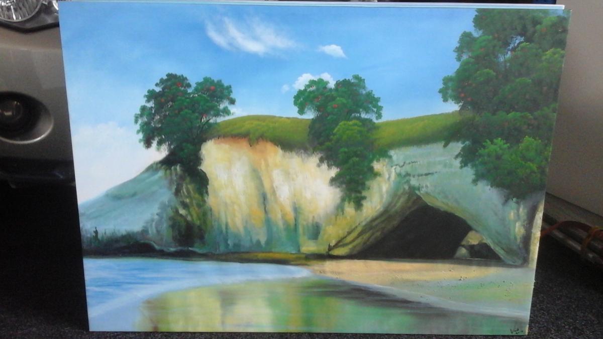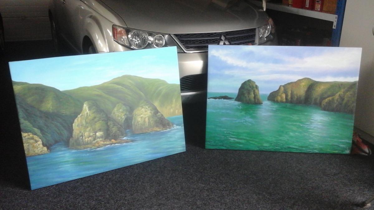 We have 4 large (1100mm x 800mm) paintings for sale, 2 are of Tory Channel looking out to Cook Strait, 1 is the Hole in the Rock, Bay of Islands, the 4th is unknown.