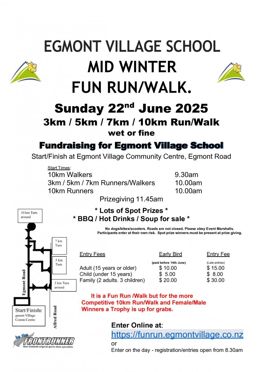 Time again for you to enjoy the country atmosphere. 300 plus turned up last year so don`t miss out. Sunday 22nd June 2025. Something for everyone. Keep a eye on Egmont Village School Facebook www.facebook.com... or register at : funrun.egmontvillage.co.nz...