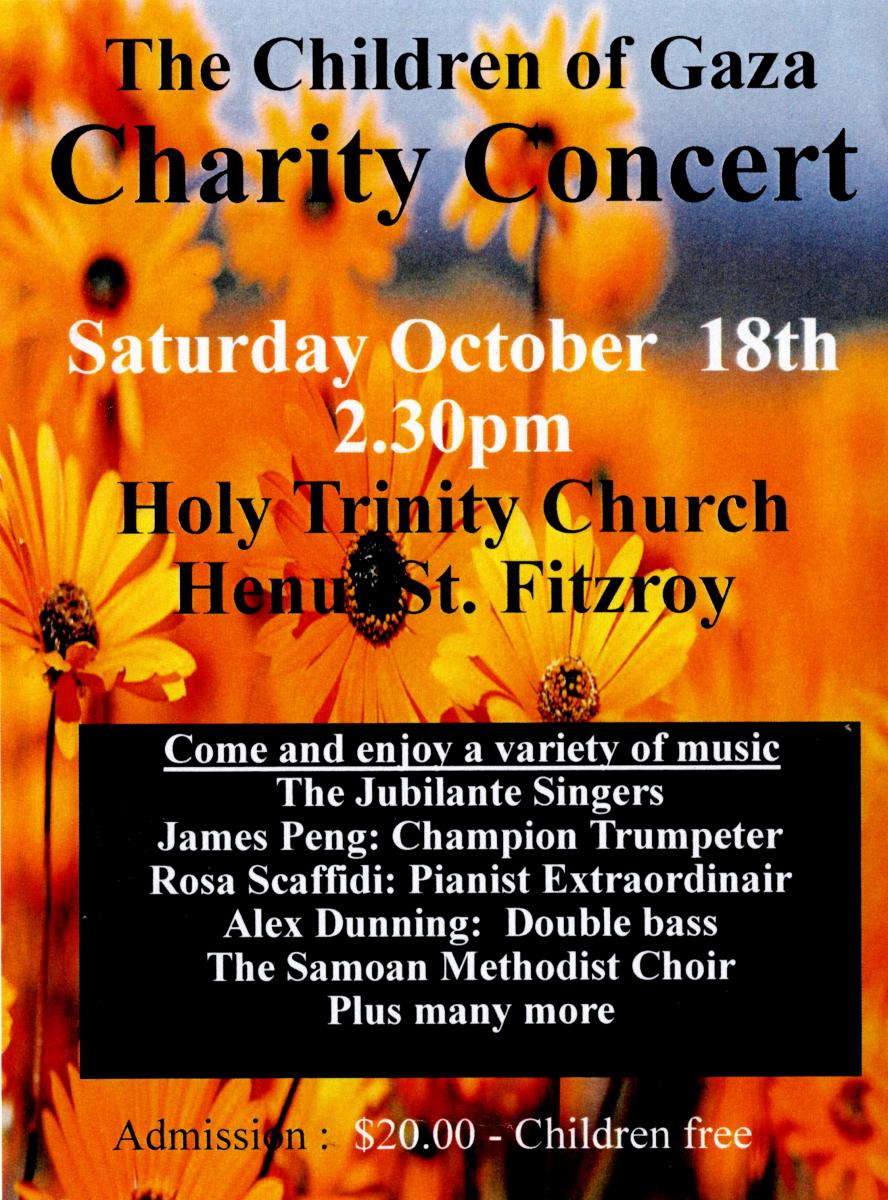 Come to a Charity Concert raising funds for the Children of Gaza. Held at Holy Trinity Church, Fitzroy on Saturday October 18th at 2.30pm.