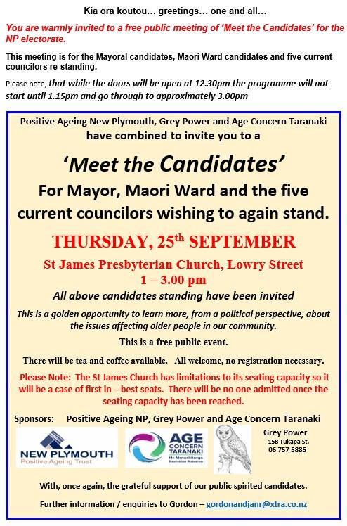 This meeting is for the Mayoral candidates, Maori Ward candidates and five current councilors … View moreYou are warmly invited to a free public meeting of ‘Meet the Candidates’ for the NP electorate.