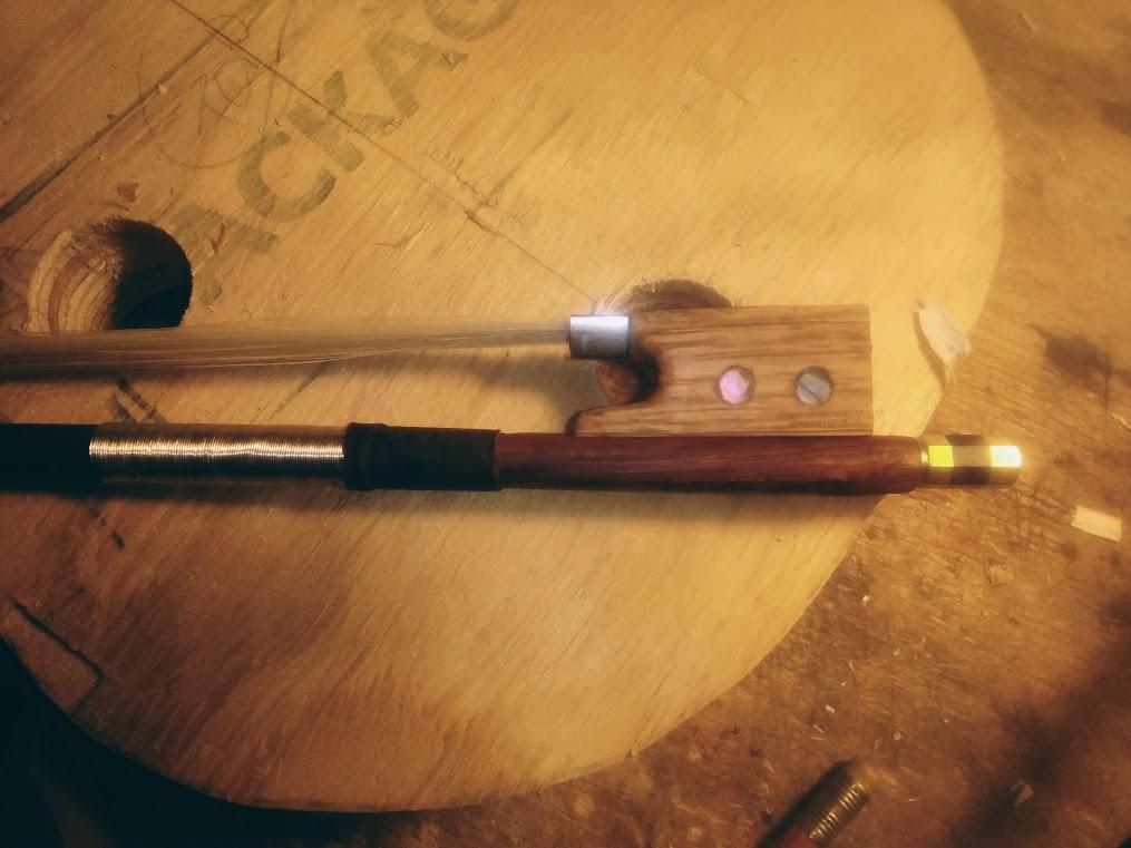 BOW: Also to my own design - a geniune J. Dodd bow, just not the London maker! I cut it from a piece of upcycled Rimu, and I used American white oak for the frog with real Mother of Pearl slider. The tip plate is bone.