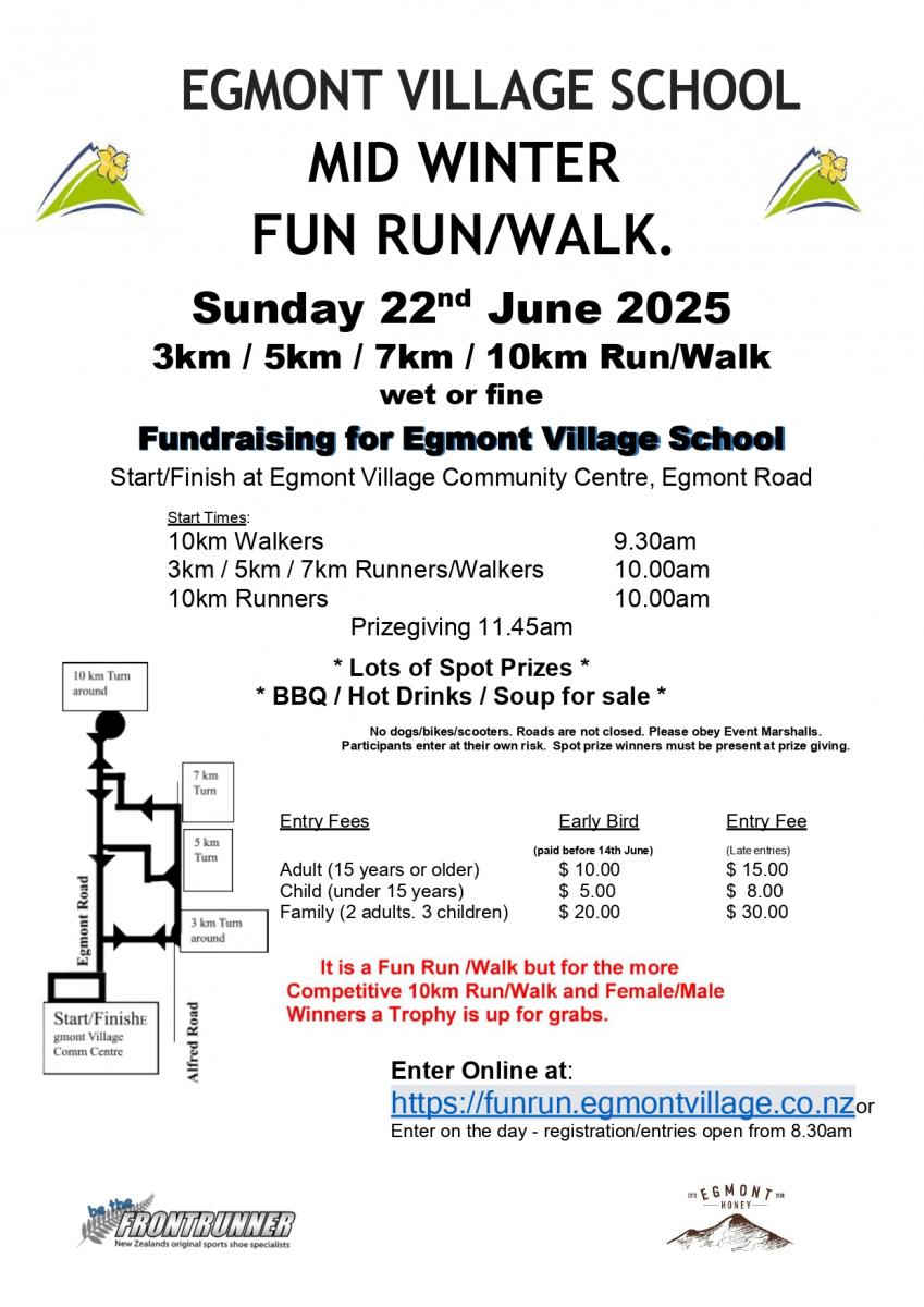 Enter on line:(By 14th June, for early bird rates.) funrun.egmontvillage.co.nz...
