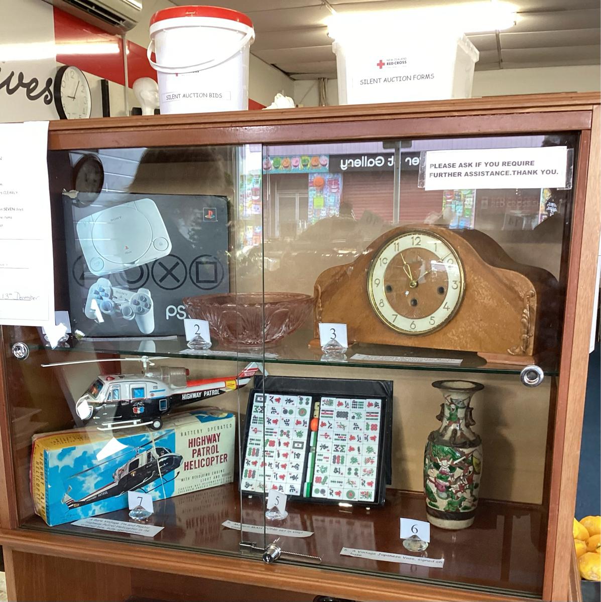 Red Cross New Plymouth 18 Gover st have amazing items in our silent auction a PlayStation One, antique vase, clock, model helicopter that flies, mahjong set, pink impression glass bowls put your best bid in. Closes Saturday 13th December at 3.00pm. We are open 7 days