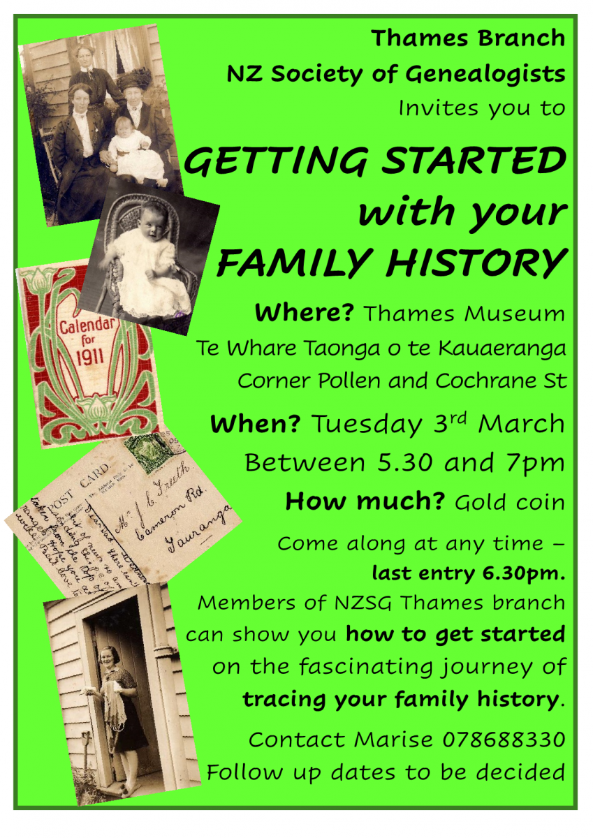 If you’d like to know more about how to research your family tree and its history, GETTING STARTED with YOUR FAMILY TREE is returning for its second autumn season with NZ Society of Genealogists Thames Branch and Thames Museum Te Whare Taonga o te Kauaeranga. We’re looking forward to getting you started.