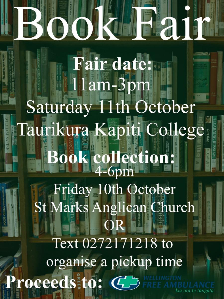 Kapiti College Academic Captains are organising a book fair in the college hall. Proceeds will go to the Wellington Free Ambulance.