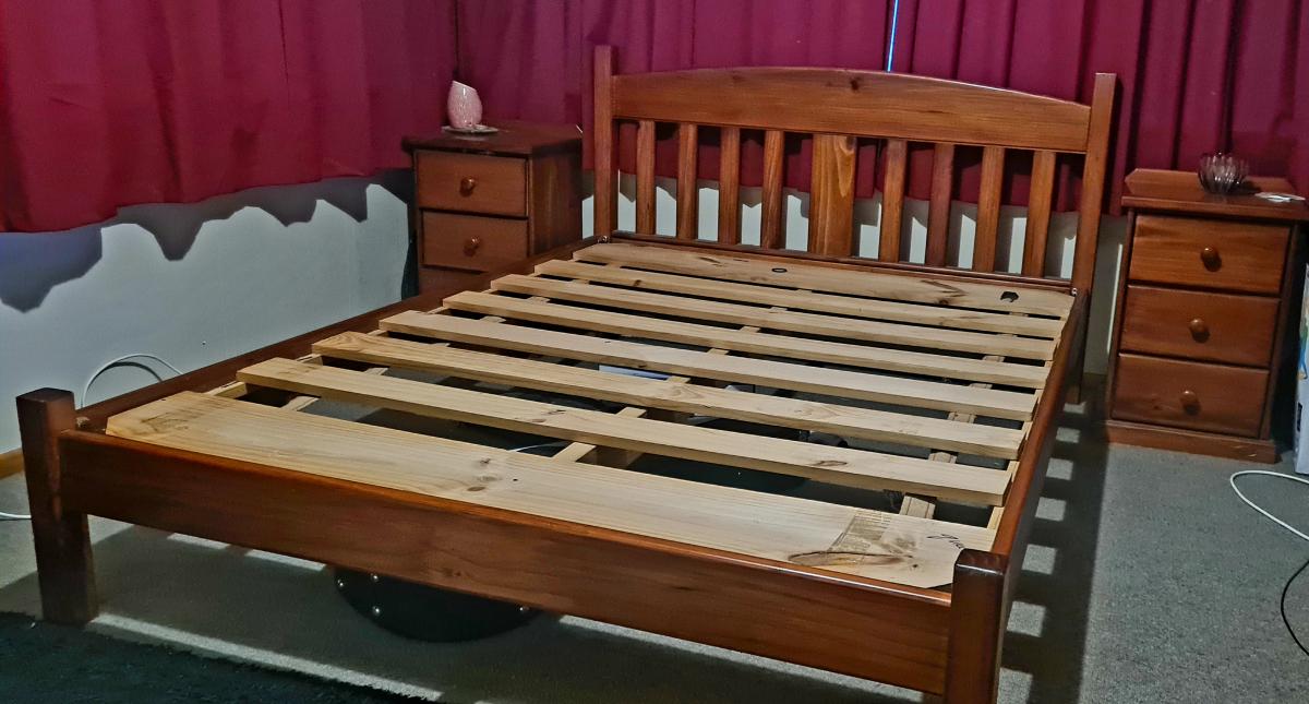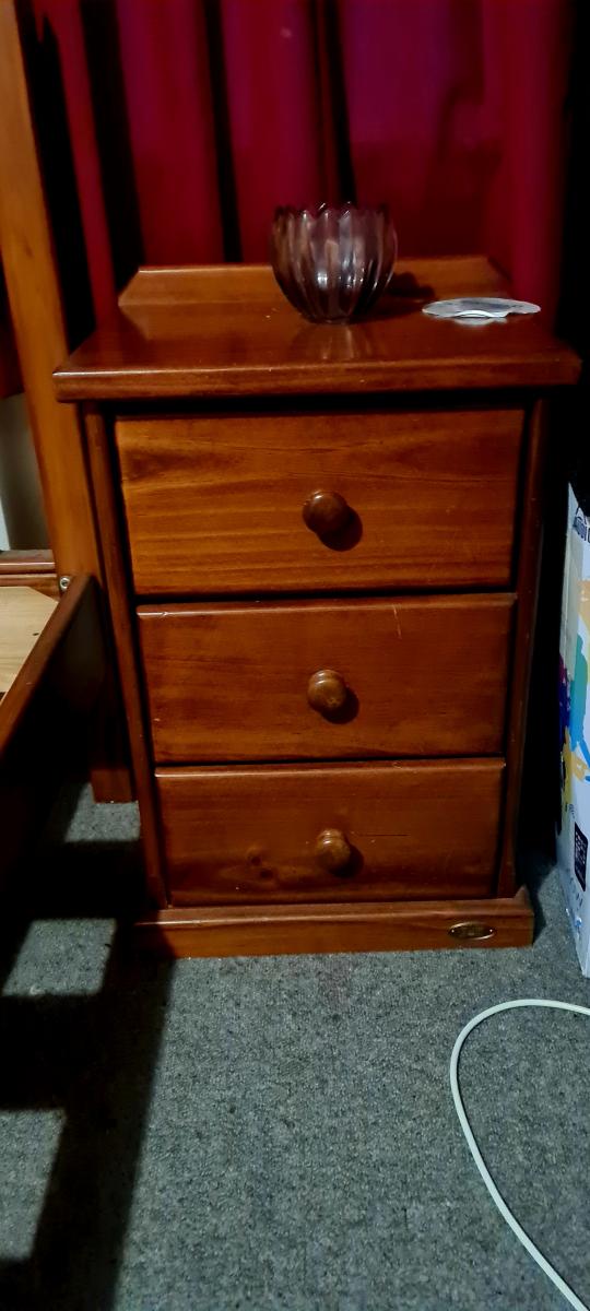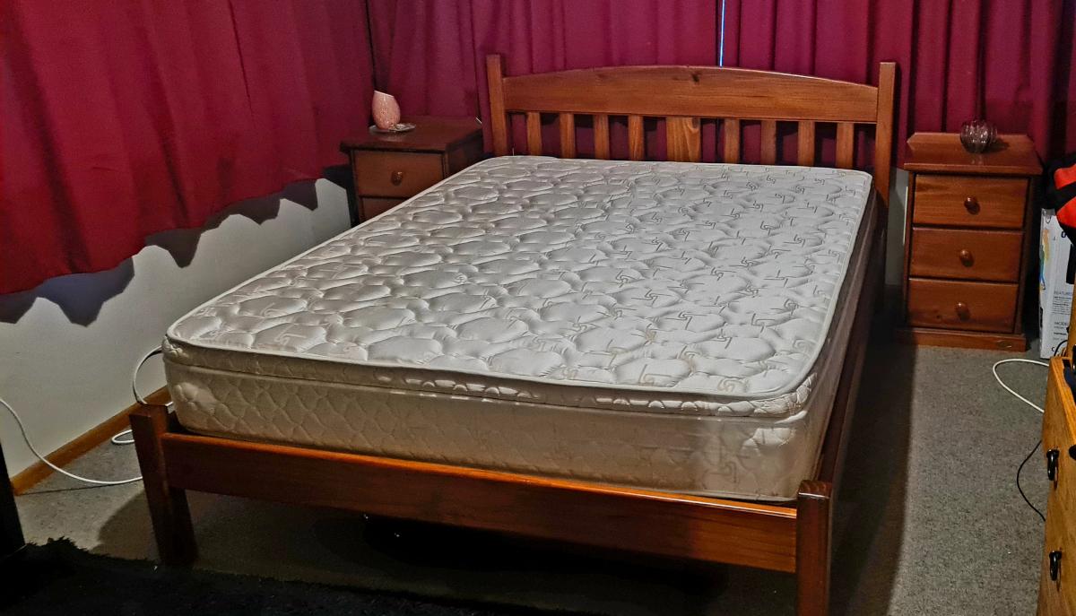 Great condition and quality Solid timber queen bed,bedside drawers,Large set of drawers...no damage to any of it maybe a few minor marks but overall top condition. Matress is a pillowtop queen(medium firmness) used and can come with a matress protector but probably worth replacing ..(The TV on the … View moreGreat condition and quality Solid timber queen bed,bedside drawers,Large set of drawers...no damage to any of it maybe a few minor marks but overall top condition. Matress is a pillowtop queen(medium firmness) used and can come with a matress protector but probably worth replacing ..(The TV on the drawers is a 50 inch to gauge the size )have upgraded our bed so we have to downsize everything to make it fit in our room .Will be disassembled by the weekend