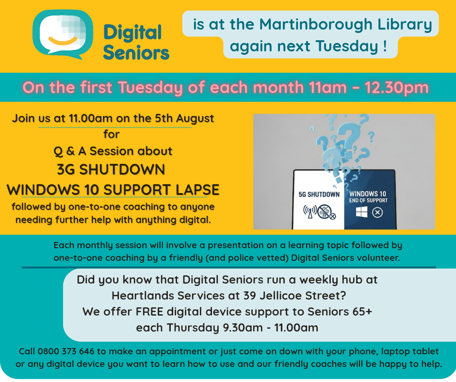 Join us at 11am next Tuesday the 5th August at Martinborough Library for a Q&A session about the 3G shutdown and Windows 10 becoming unsupported- brought to you by Digital Senior's Rhonda McCormick and the Wairarapa Library Service - Coaches will be available afterwards for one-to-one … View moreJoin us at 11am next Tuesday the 5th August at Martinborough Library for a Q&A session about the 3G shutdown and Windows 10 becoming unsupported- brought to you by Digital Senior's Rhonda McCormick and the Wairarapa Library Service - Coaches will be available afterwards for one-to-one help with anything digital and remember we are also available each week on Thursday morning 9.30am - 11.00am at Heartland Services 39 Jellicoe Street - Call 0800 373 646 to make an appointment or just come on down with your phone, laptop or tablet.