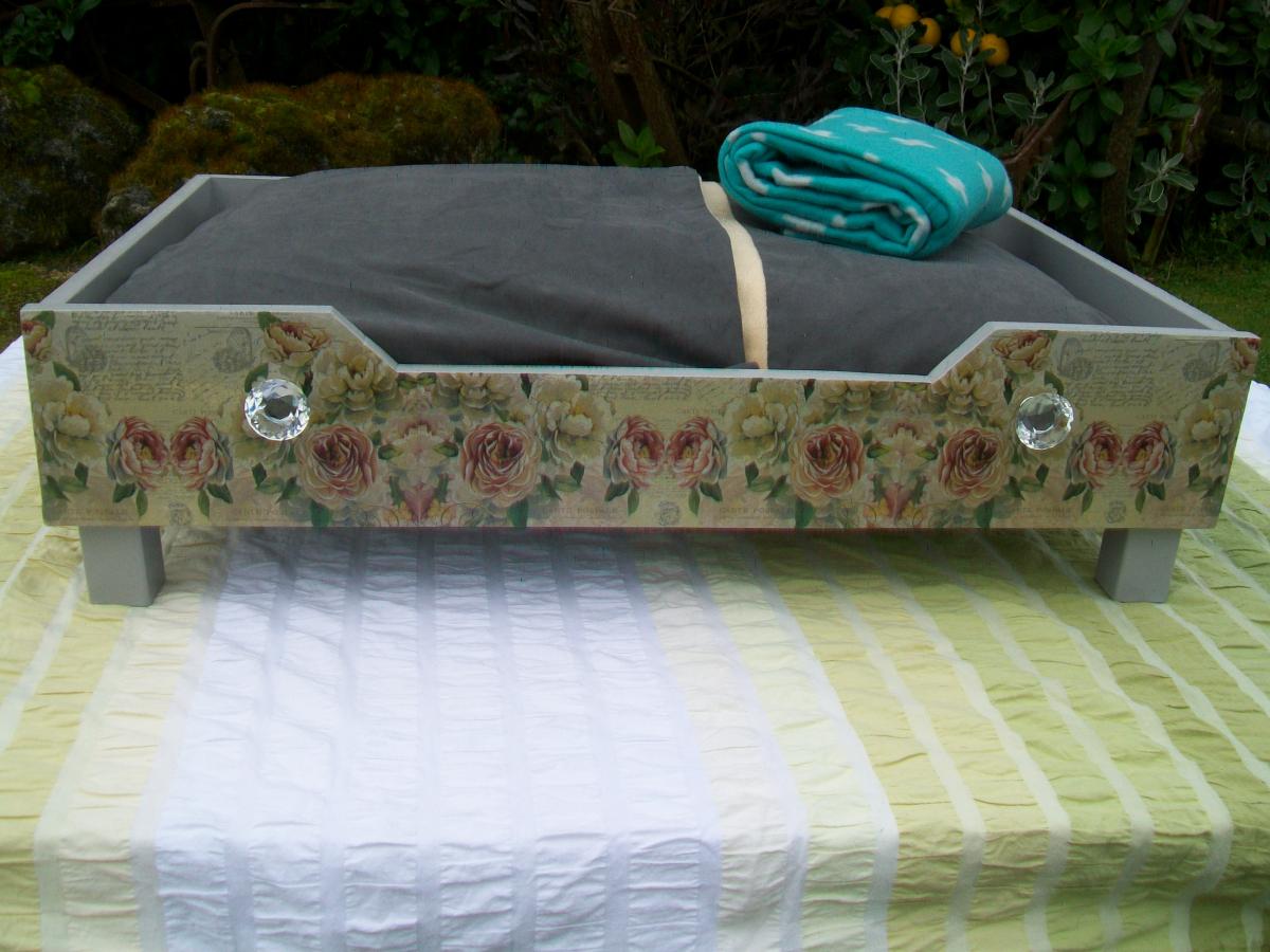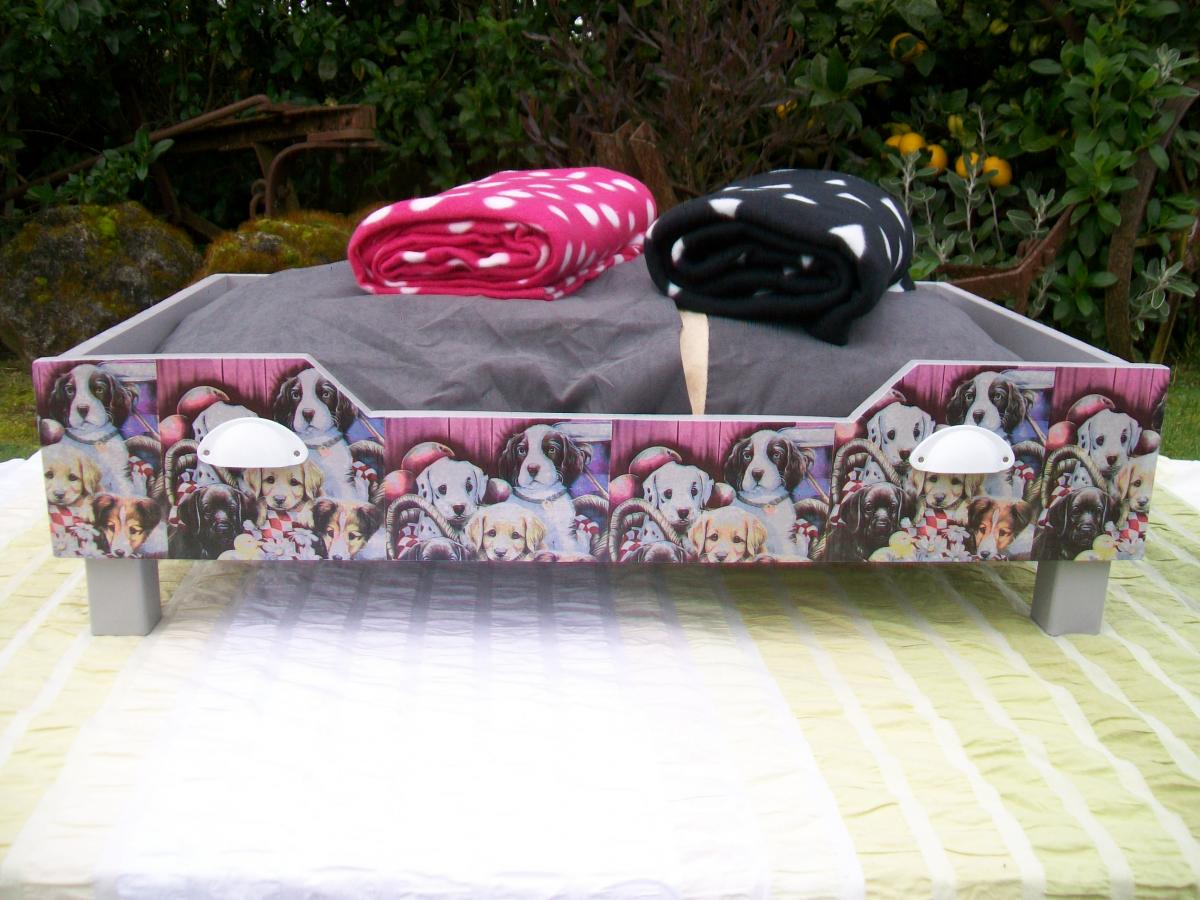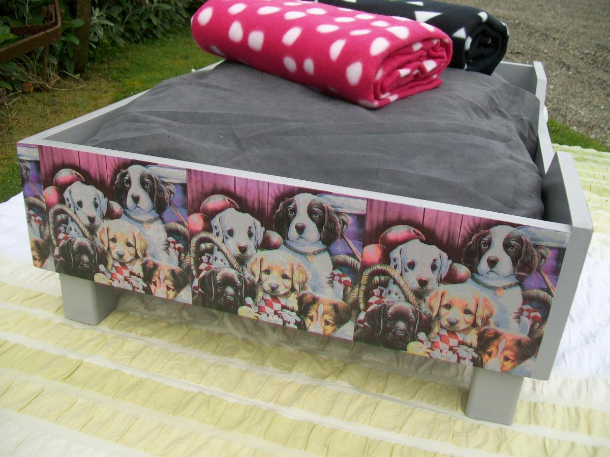 ***The bed with the dogs on the front and sides measures 50cm x 80cm. You have a choice of the pink or black blanket. $75.00