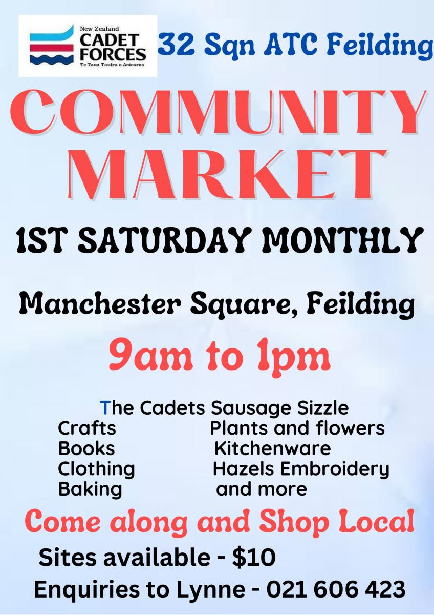 Don't miss the monthly market in the Feilding Square this Saturday 6th September 9am - 1pm. Loads of variety on the stalls and don't forget the delicious sausage sizzle cooked fresh by the Air Cadets. More sites available.