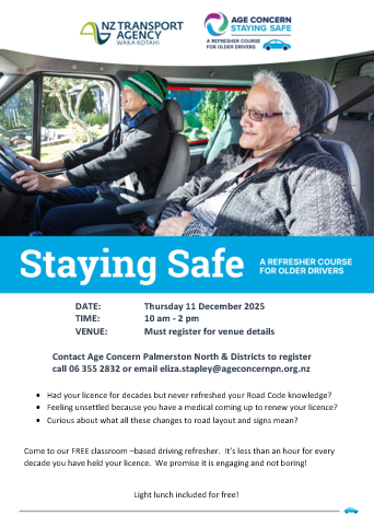 We have our final Staying Safe driving refresher course of the year coming up next month on Thursday 11 December from 10am - 2pm in Palmerston North.