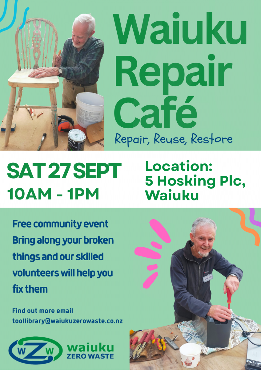 Our usual repair offering will be on to help fix your household items. The aim is to keep your much loved things out of landfill by… View moreDo you have something broken that needs fixing? Bring it along to the Waiuku Repair Cafe!