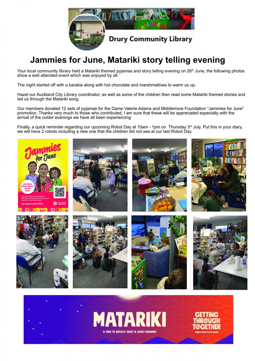 Your local community library held an evening to recognise Matariki and contribute to Valarie Adams "Jammies for June" program