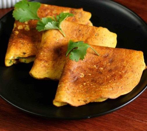 Yummy Crepes made of gramflour mix with homemade spices, onion, tomato, ginger, garlic & coriander. Healthy & Gluten free