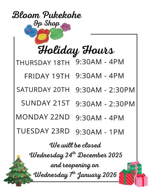 Bloom Pukekohe Op Shop - Christmas/New Year opening hours