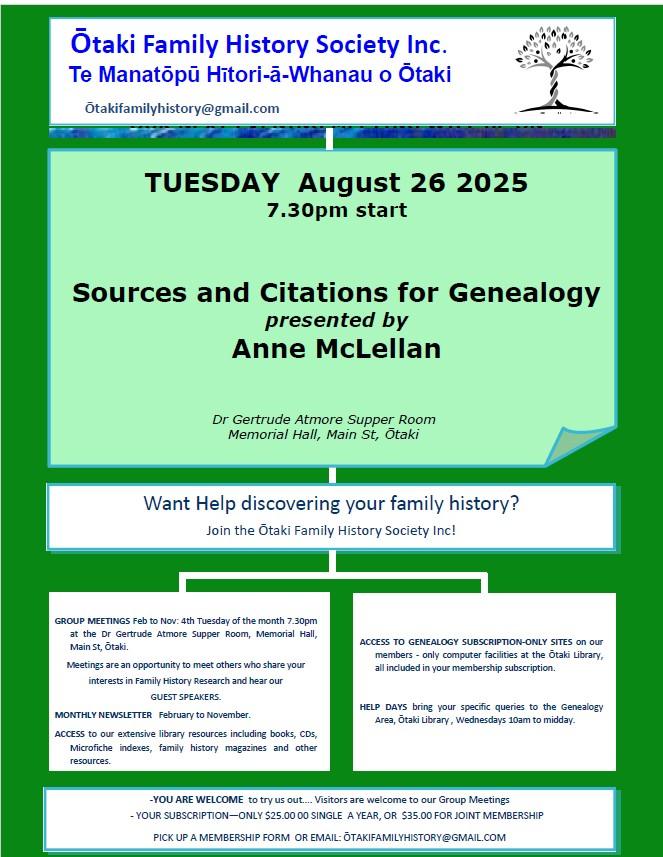 This months meeting is on the 23 July starting at 7.30 p.m at Dr Gertrude Atmore Supper Room, Memorial Hall, Main St, Otaki.