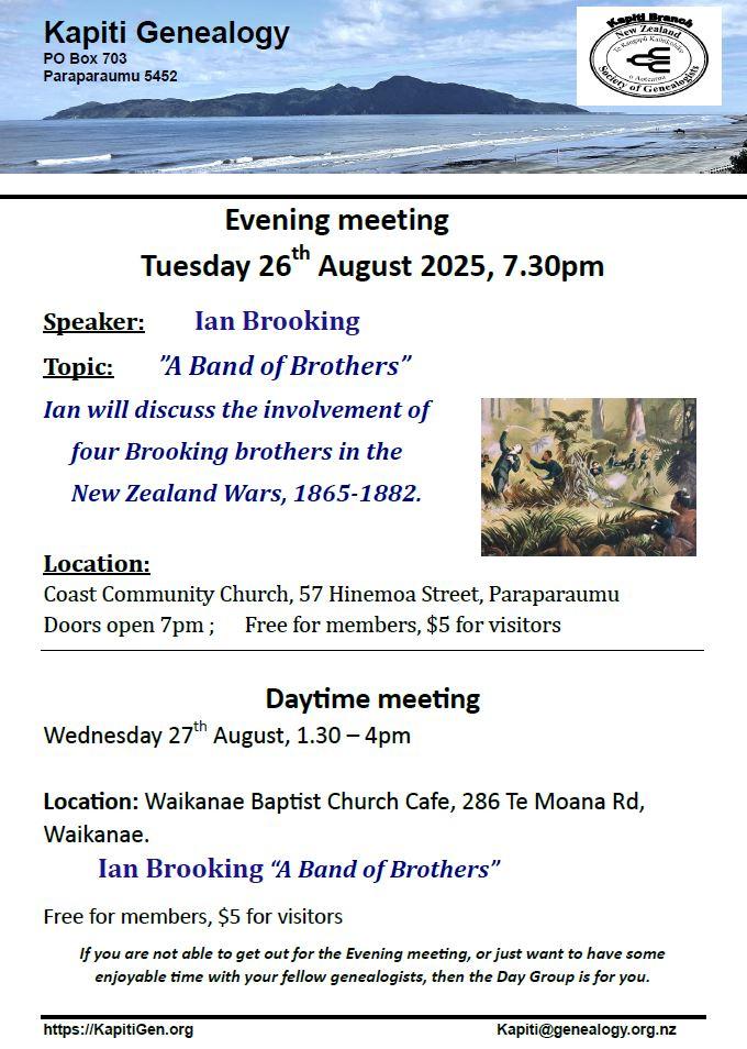 Our speaker this month is Ian Brooking who will discuss the involvement of four Brooking brothers in the NZ Wars 1865-1882.