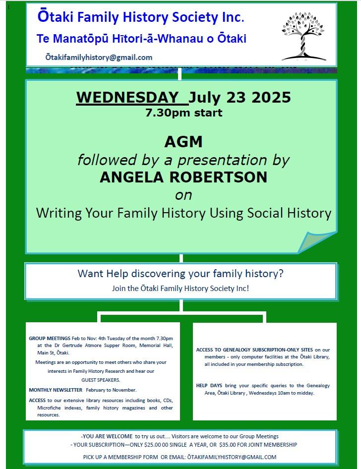 Venue: Dr Gertrude Atmore … View moreThe Otaki Family History Society will have this month's meeting on Wednsday, 23 July at 7.30 p.m
