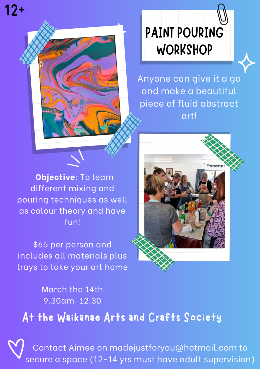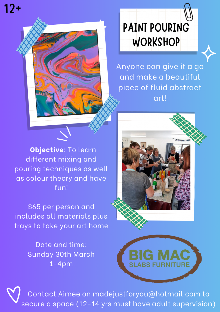 We've got two new beginner Paint Pouring workshops coming up in March, one at the Waikanae Arts and Crafts Society and the second at Big Macs Slabs. See posters attached!