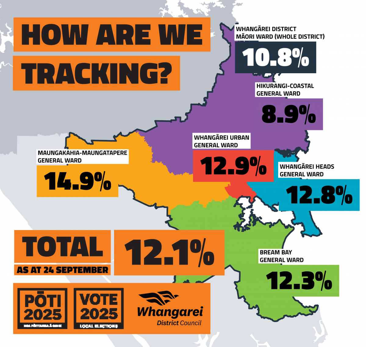 Big friendly "Kia ora" to the 8,125 people who have voted in Whangarei District so far! We're stoked to see a strong start in our voting stats but there's still 87.9% of eligable voters who haven't ranked their candidates yet.