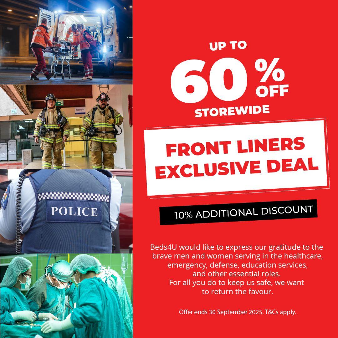 To New Zealand’s frontline heroes: we see you, we thank you, and we’re honoured to stand with you. Your dedication keeps our communities safe and strong. As a small gesture of appreciation, we’re offering a Frontliner Discount. It’s our way of giving back to those who give so much, every … View moreTo New Zealand’s frontline heroes: we see you, we thank you, and we’re honoured to stand with you. Your dedication keeps our communities safe and strong. As a small gesture of appreciation, we’re offering a Frontliner Discount. It’s our way of giving back to those who give so much, every single day. This isn’t just a discount. It’s a partnership of gratitude and support, a true win-win that cares for you and the families you serve. From all of us at Beds4U, thank you for everything you do.