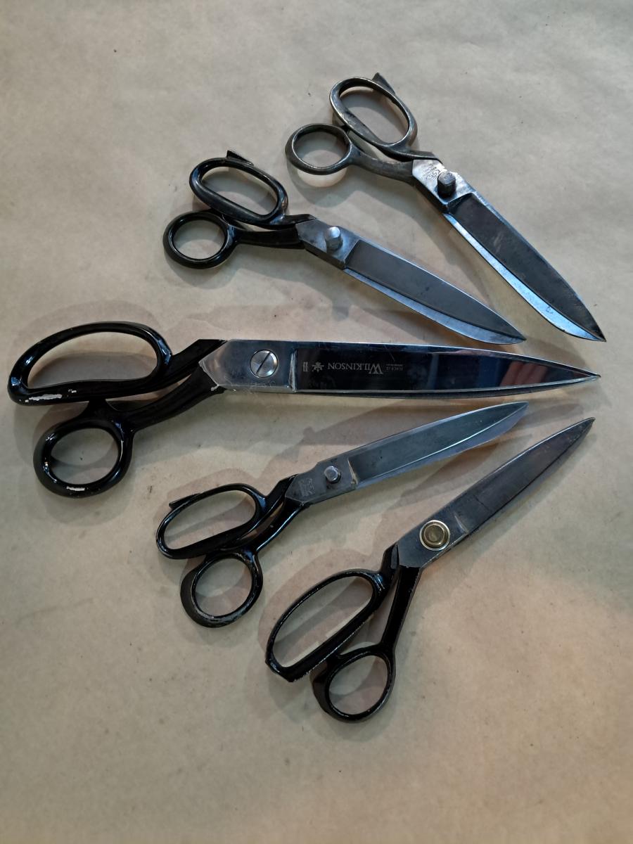 Pictured is a selection of scissors brought in for sharpening. These are made from cast steel, not cut from sheet steel—usually resulting in a more rigid, higher-quality tool.