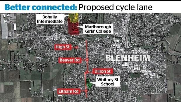 The route will run along Eltham Rd, up either Carr St or Dillon Street and along Beaver Rd to the Taylor River Reserve, which cyclists can then cross, bypassing busy traffic in Blenheim's town centre.