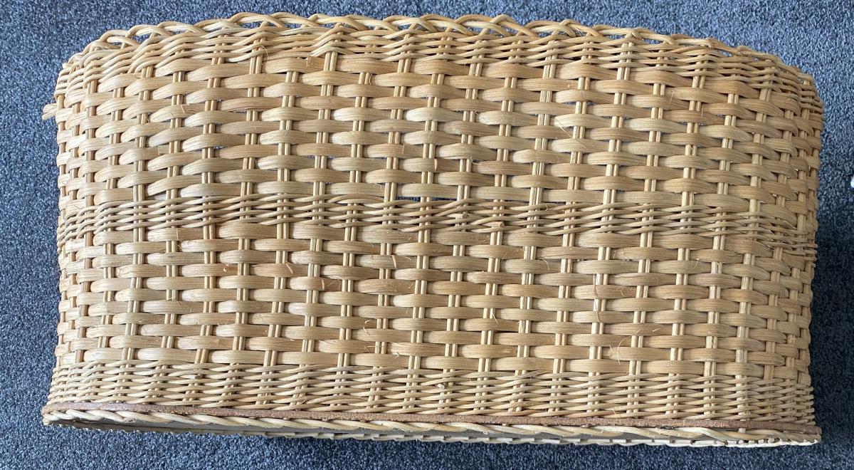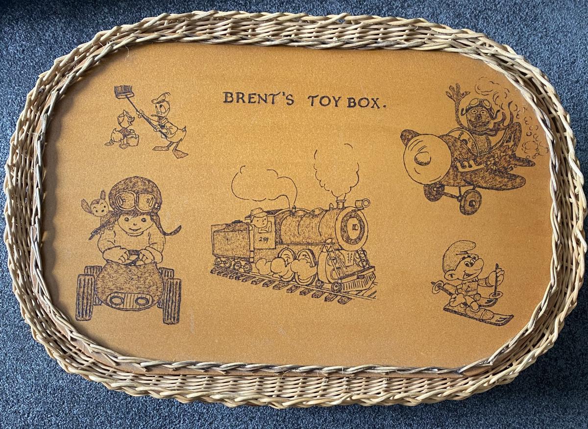 Cane toy box with poker burnt pictures including the name Brent. Approx 40 years old. My son would like to hand this on to another Brent please.