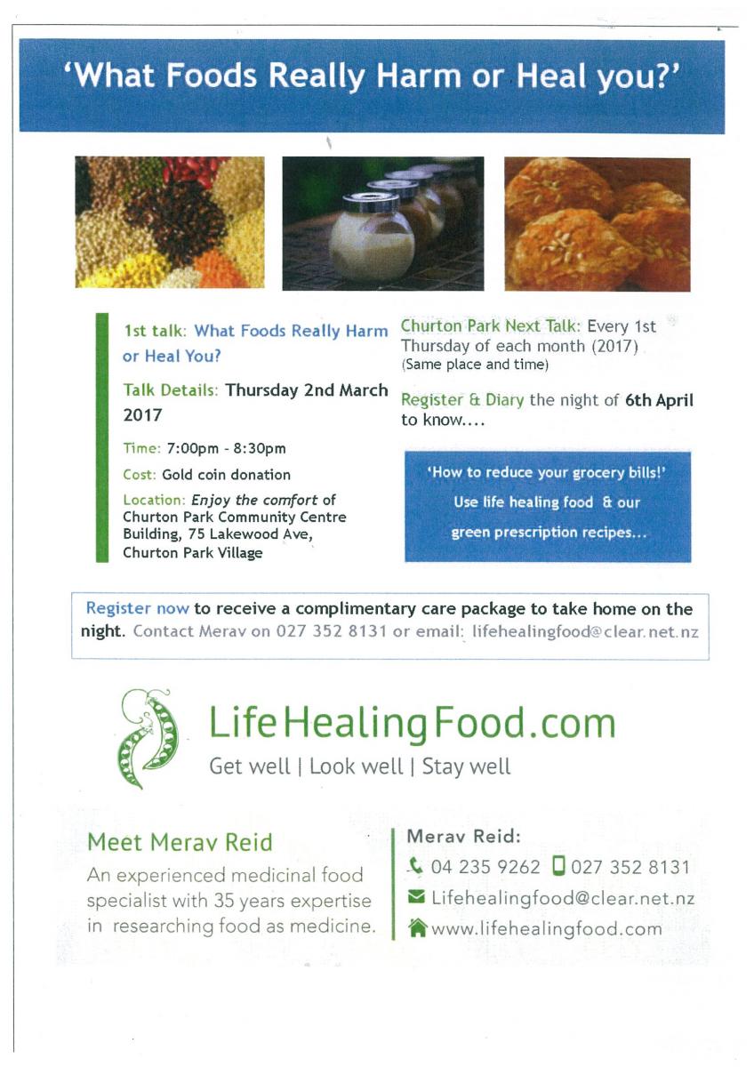 On the 1st Thursday of each month Life Healing Food is here providing health talks on various topics. The talks are delivered by Merav Reid an experienced medicinal food specialist with 35 years experience researching food as medicine. Entry is by gold coin donation. The first talk is on 2 March … View moreOn the 1st Thursday of each month Life Healing Food is here providing health talks on various topics. The talks are delivered by Merav Reid an experienced medicinal food specialist with 35 years experience researching food as medicine. Entry is by gold coin donation. The first talk is on 2 March from 7-8.30pm. The topic is 'What Foods Really Harm or Heal you?'. To register your place please contact Merav Reid on lifehealingfood@clear.net.nz or 027 352 8131.