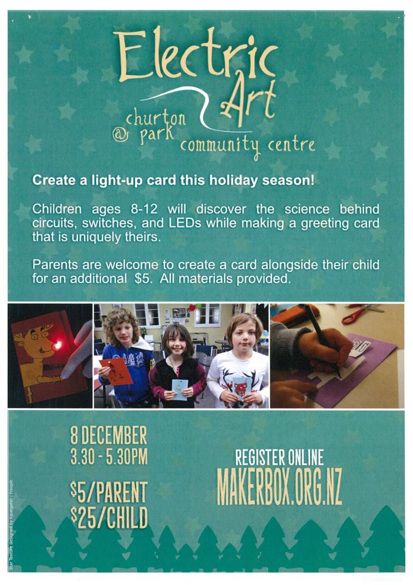 Children ages 8-12 will discover the science behind circuits, switches, and LEDs while making a greeting card that is uniquely theirs. Cost $25. Parents are welcome to create a card alongside their child for an additional $5. Register online Makerbox.org.nz