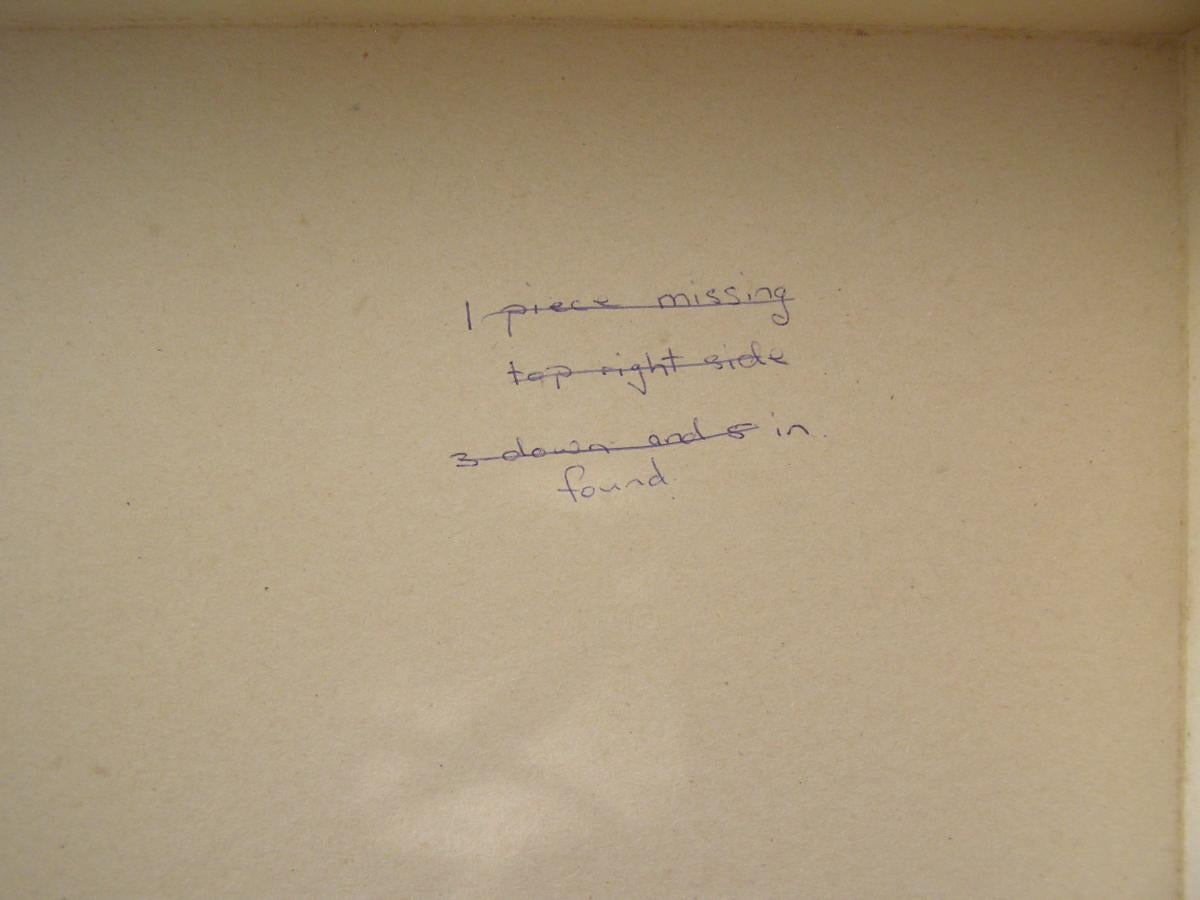 The box is rubbed along the edges and sellotape has torn some of the picture off the back of the base. There is writing on the inside of the lid.