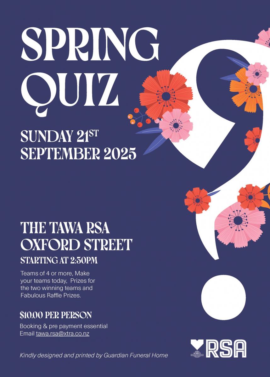 Tawa RSA will be hosting a quiz on Sunday 21st September at 2.30pm. Teams with 4-8 , $10pp