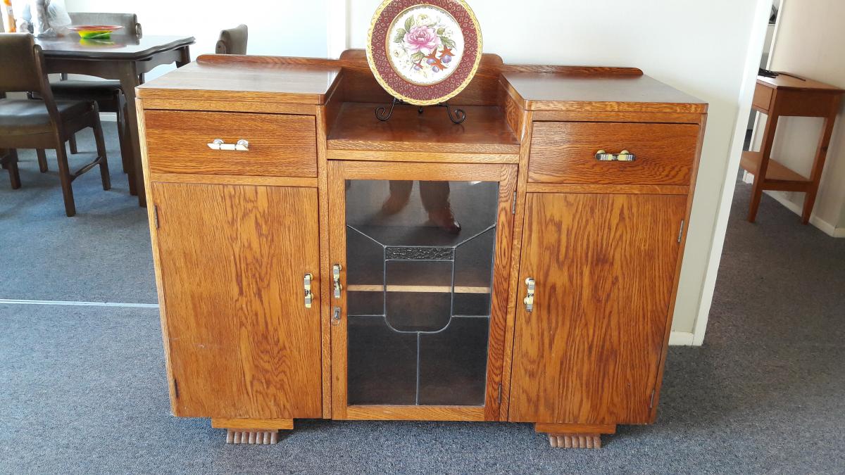 Solid oak China cabinet in excellent original condition. 1 handle has been replaced