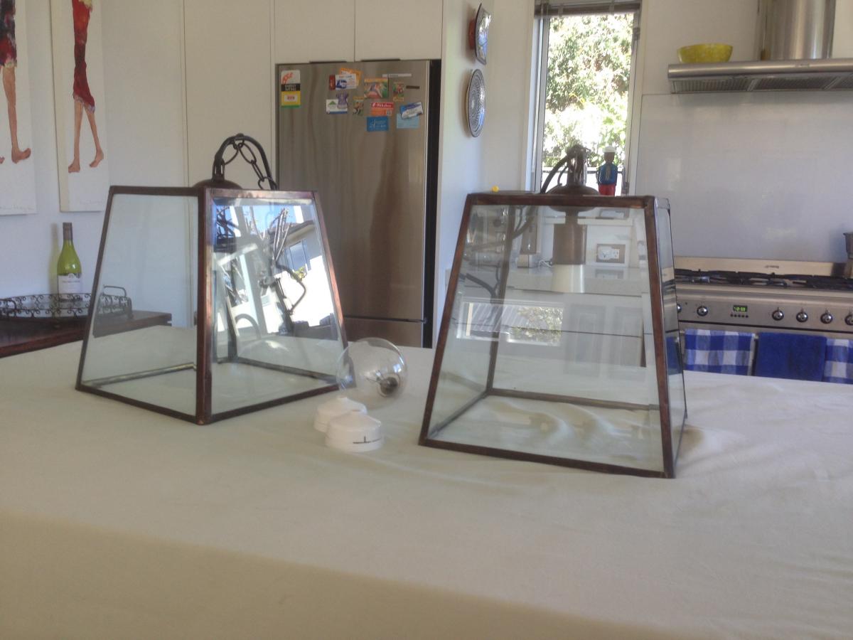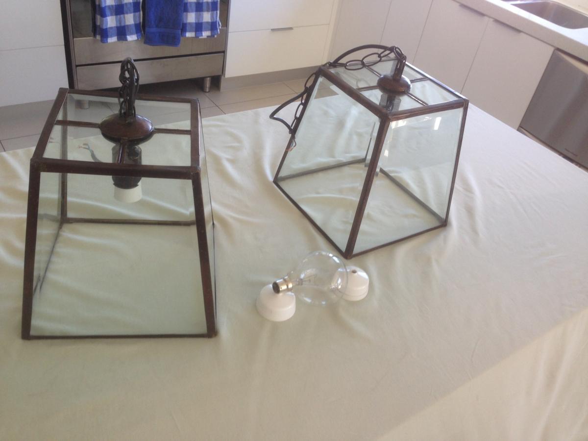 Fo sale. 2 x large (20 cm wide at top, 28cm wide at base, 28 cm high, 3.8 kgs ) interior lights. Complete with wiring chains and ceiling hooks.