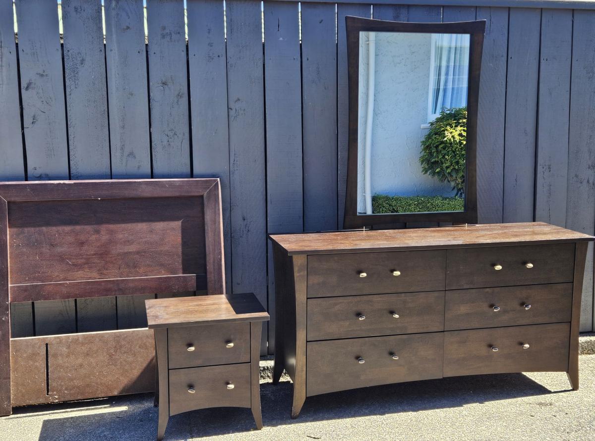 Brown matching Northwood furniture bedroom suite, as pictured includes one bedside table, a single headboard (had on king single bed) and large double dresser. In good condition, just needs a clean as been in storage! Feel free to ask questions including dimensions. Highest offer wins.