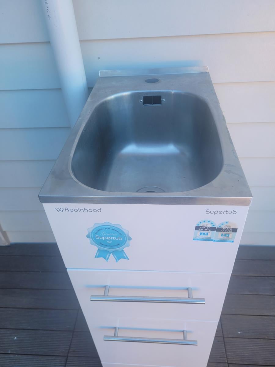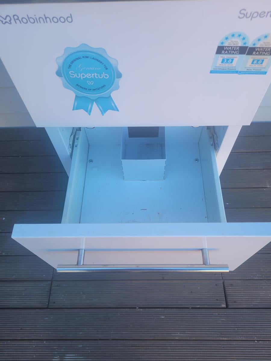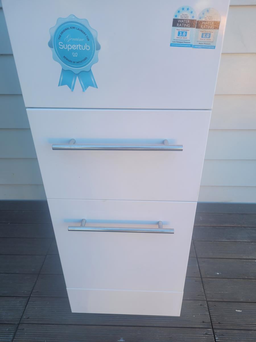 Designed for smaller laundries, this is a compact slim-sized tub with two storage drawers. This model also features hidden internal washing machine taps.