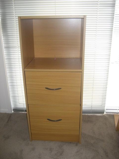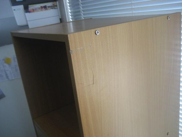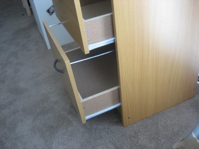 MDF coated with woodgrain laminate. Lots of scuffs and scratches. Top section can hold foolscap lever arch files but not file boxes.