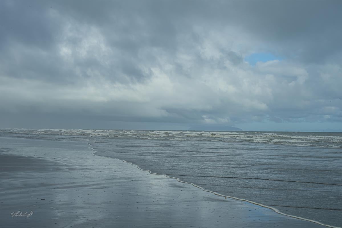 Godwits in flight. A photograph I took at the Manawatu River Estuary, in November 2005.