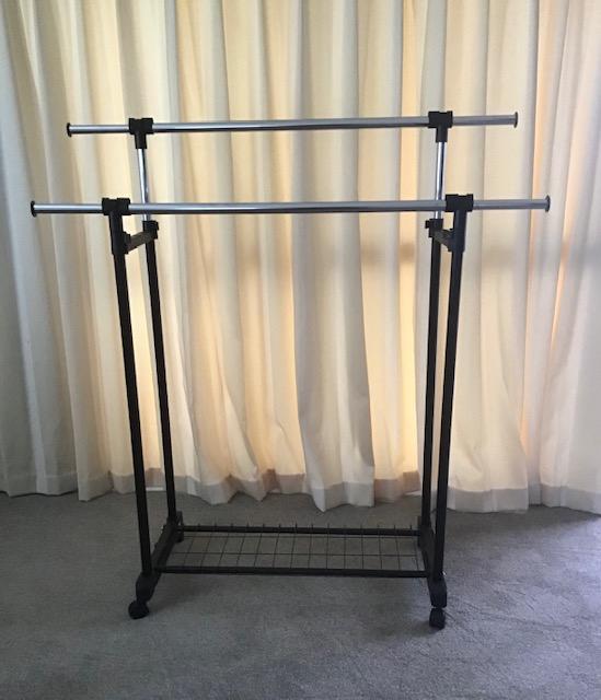 Two clothes racks, one with two rails, both adjustable, as new and on castors. They come apart for transport. $15 and $25 ono.
