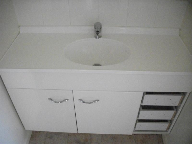 Bathroom vanity, draw fronts missing. Rest of unit in good condition and vanity top comes with tap. 1200mm wide. Collect in Snells Beach. Call 027 2399182.