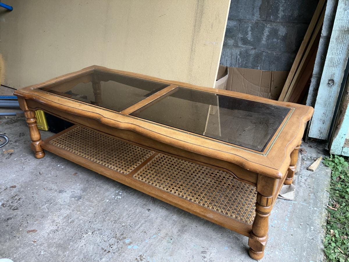 Beautiful glass topped Remu coffee table with cane lower shelf. 1320mm wide x 575mm deep x 405mm high. Will take offers