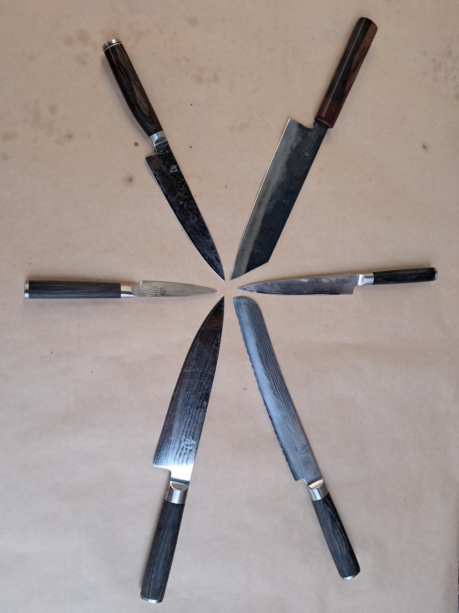 A selection of quality Japanese knives were brought in for sharpening. These knives can attain an incredible level of sharpness, but they can also chip easily if they strike hard objects like bone.