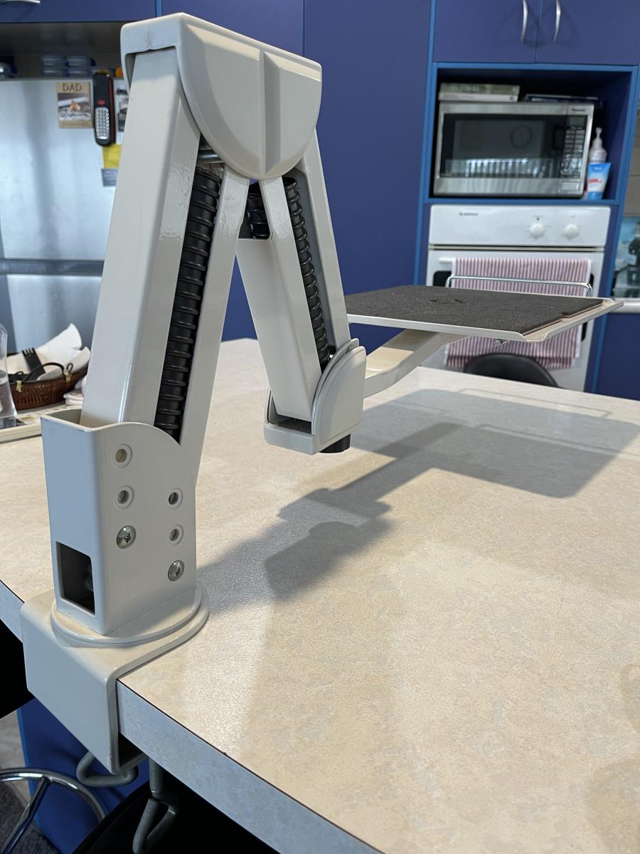 The stand clamps to the edge of your desk as shown in the pic (on my kitchen bench for show). The back of the arm is currently set at the lowest of 3 heights