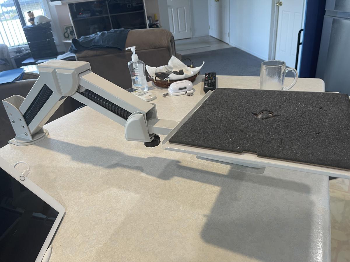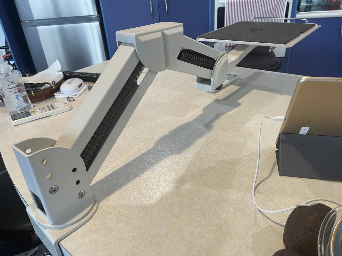 The stand clamps to the edge of your desk as shown in the pic (on my … View moreThis robust (steel), heavy-duty stand lifts your computer screen off the desk, allowing 360 degree rotation of the screen, side-to-side and forward and back movement, and height/angle adjustment, giving clear space underneath.