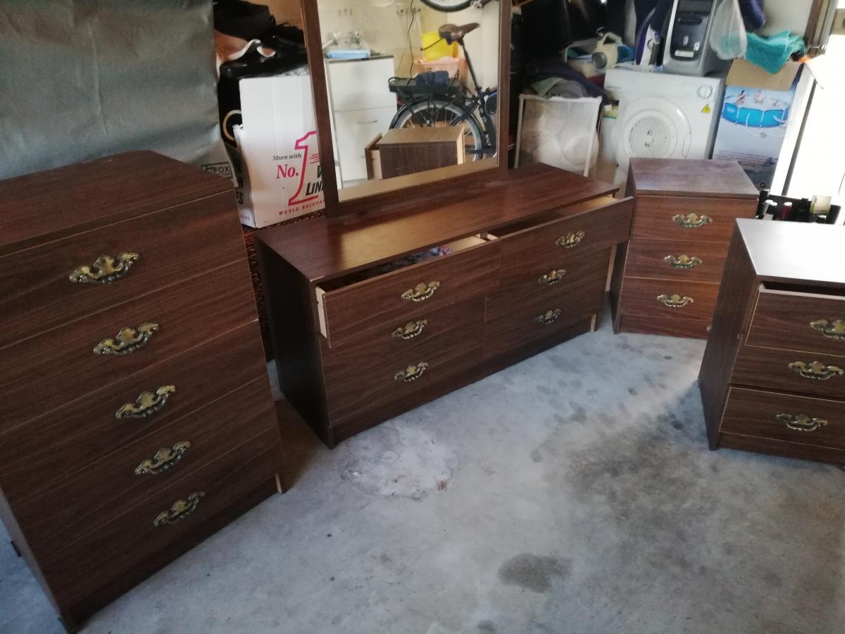 6 drawer lowboy dresser with large mirror, 5 drawer tallboy and 2 bedside 3 drawer … View moreI have a used bedroom suite to give away. It is in very reasonable condition for its age and will last for many more years. I want it taken as a complete set, not to give away separately and drag it out..