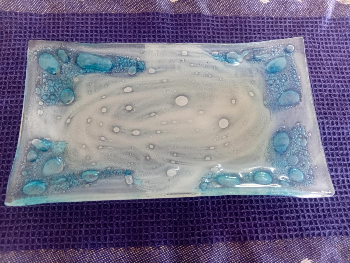 Beautiful Collectible vintage turquoise solid bubble glass dish, great condition. 20cm long x 12cm wide.