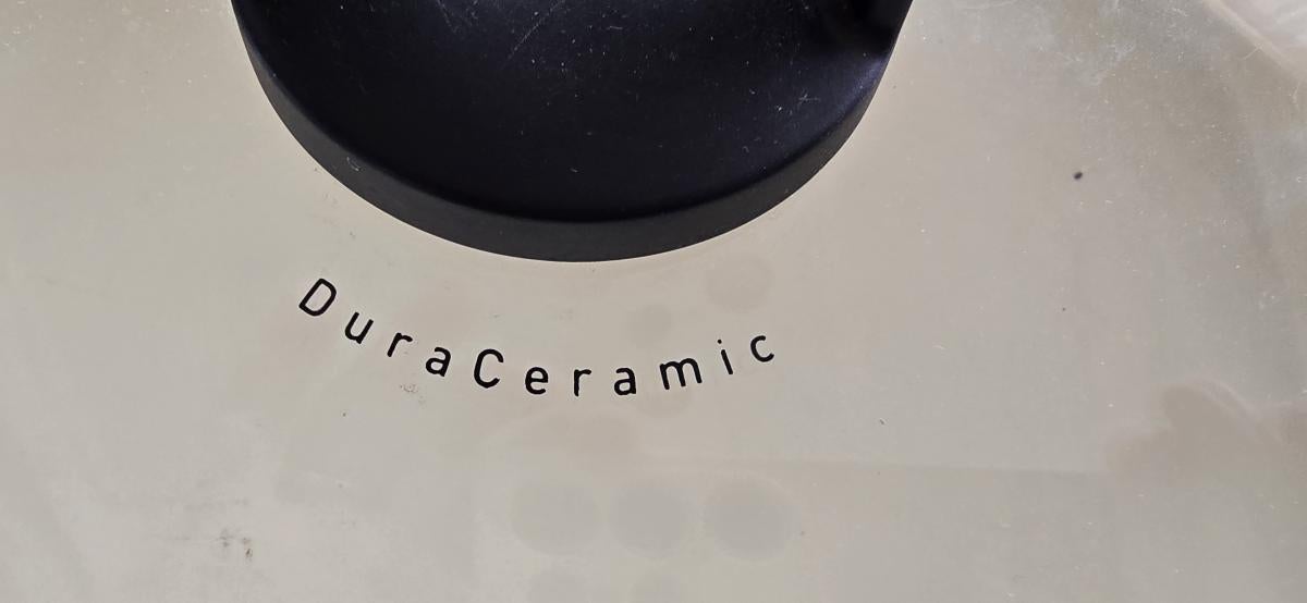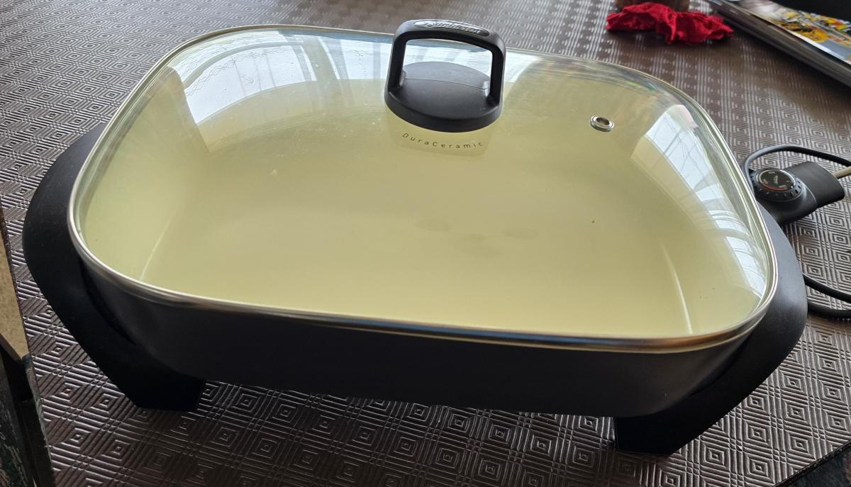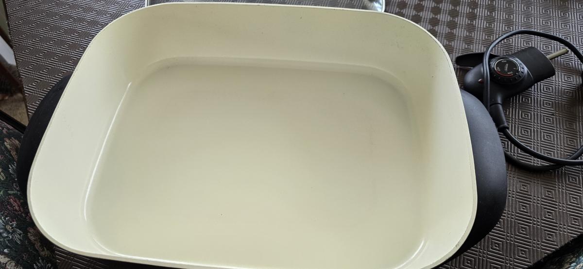 Cremanic inside. You can use metal fish slice or spoons never scratch it. With lid extra long frying pan, not the normal square one oblong. Pick up only cash only thankyou phone me on 075440434.
