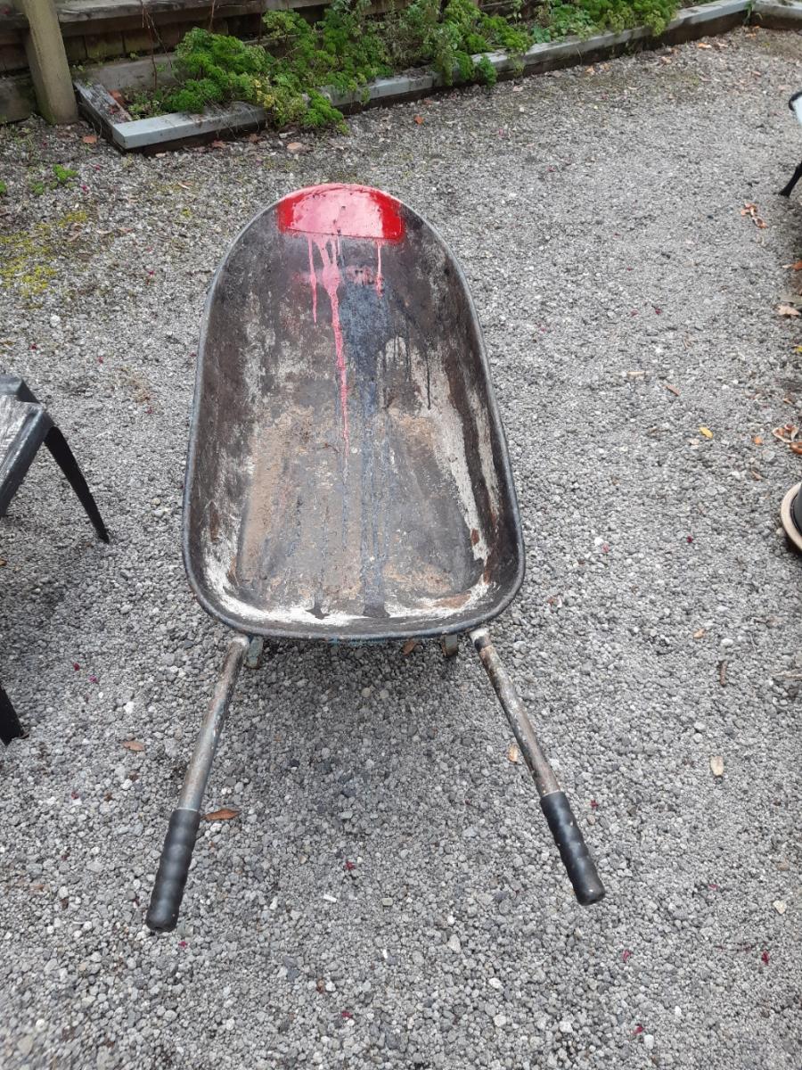 Free wheel barrow- Somewhat battered and rusty hole in spout patched with Galvanised sheet.